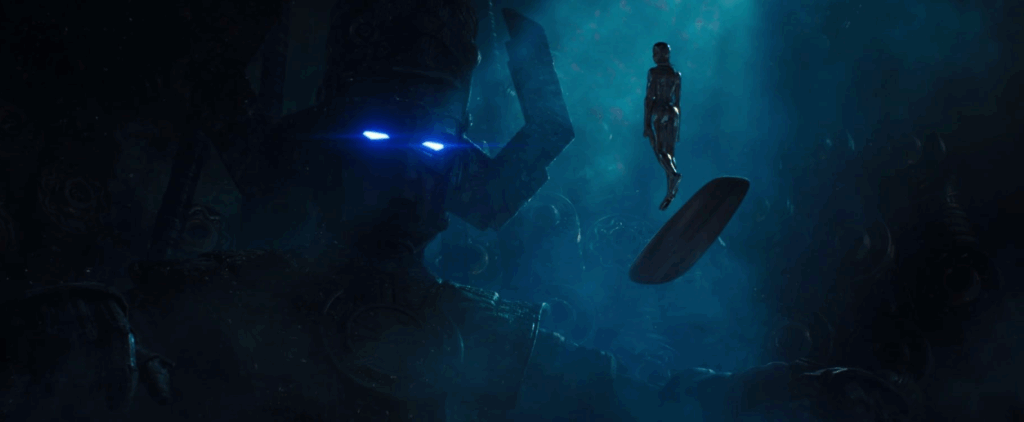 El gran villano de esta historia es Galactus, una entidad cosmica capaz de deborar planetas. Sin embargo aquí su presencia es insípida, desdibujada, una amenaza genérica que nunca transmite ni temor ni fascinación. El Galactus de Shakman es un ente sin alma, sin propósito, que aparece como excusa para el clímax, sin construcción previa ni peso emocional. En otras palabras: el peor Galactus imaginable. Su heraldo, Silver Surfer (Julia Garner), tampoco consigue mejorar el panorama; está desaprovechada, usada más como una herramienta de guion que como un personaje con conflicto o dimensión propia.